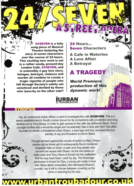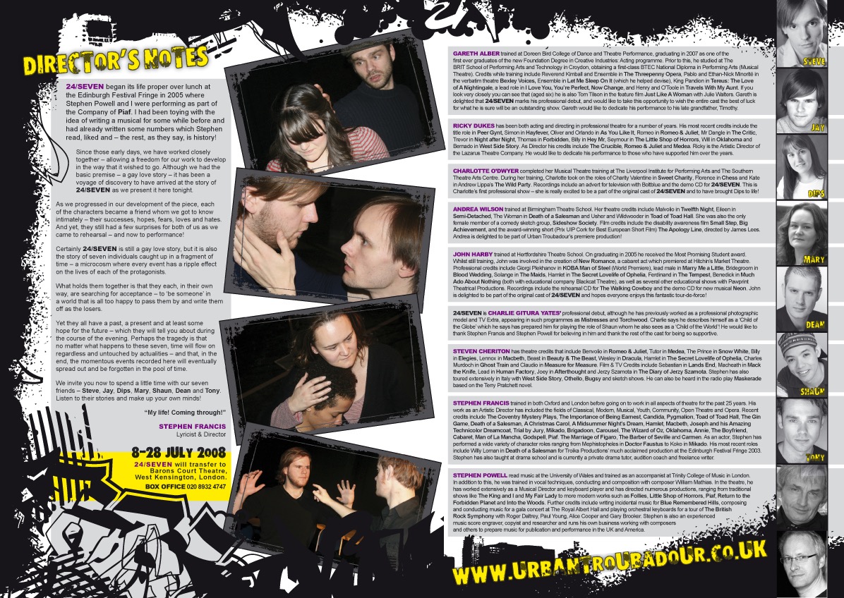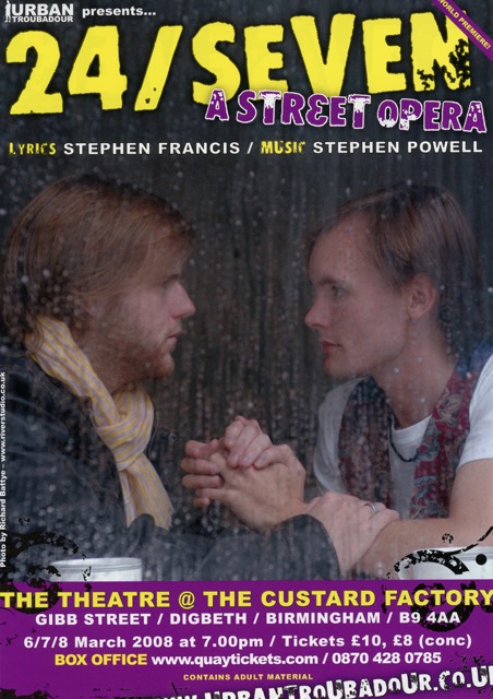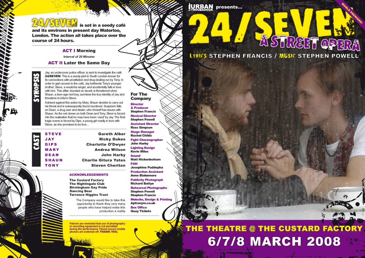 The World Première production of 24/SEVEN was staged in Birmingham from 6 to 8 March 2008 at The Theatre @ The Custard Factory.